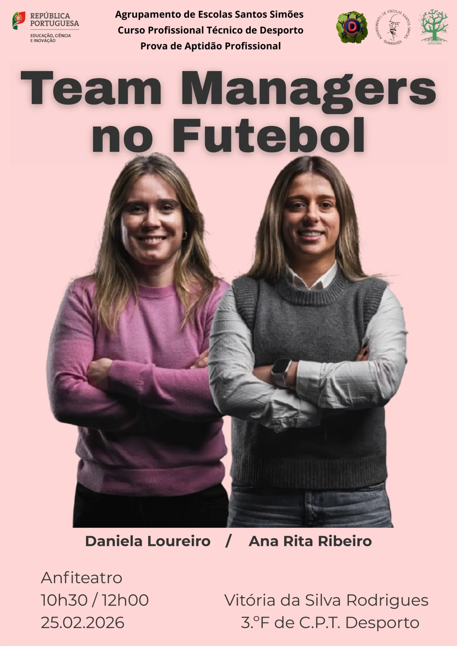 No dia 25 de fevereiro de 2026 (quarta-feira), os alunos das turmas 1.ยบF. 2.ยบF e 3.ยบF do Curso Profissional Tรฉcnico de Desporto, das 10h30 ร s 12h00, vรฃo participar numa palestra com a Coordenadora Futebol feminino e Team Manager da Equipa de Futebol (sรฉnior feminino) do Vitรณria Sport Clube, Ana Rita Ribeiro e Daniela Loureiro, respetivamente.